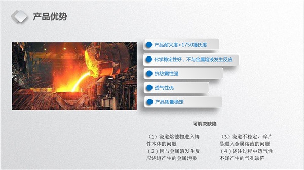 我司是研發(fā)、生產(chǎn)鑄造專用高溫陶瓷澆道管、橫澆道、直澆道、內(nèi)澆道、澆口杯、過(guò)濾座等系列產(chǎn)品的高科技企業(yè),耐火陶瓷管產(chǎn)品性能在行業(yè)中處于領(lǐng)先地位,填補(bǔ)了國(guó)內(nèi)空白,是提高鑄件內(nèi)在質(zhì)量的必備輔助材料。在中國(guó)是核電、高鐵及跨國(guó)大型鑄造集團(tuán)指定耐火澆道供應(yīng)商。經(jīng)過(guò)應(yīng)流股份(603308)、中車集團(tuán)株洲電力機(jī)車有限公司、中車集團(tuán)長(zhǎng)江車輛有限公司銅陵分公司,株洲斯威鐵路產(chǎn)品有限公司、泰鋼合金(深圳)、Metso Outotec、andritz、江蘇神通閥門股份有限公司等數(shù)十家集團(tuán)企業(yè)的使用,一致認(rèn)為該系列產(chǎn)品能有效提高鑄件質(zhì)量。特別是對(duì)檢測(cè)手段嚴(yán)格的高端鑄件質(zhì)量提高明顯。廣泛用于高端鑄造企業(yè)生產(chǎn)核電、礦機(jī)、高鐵、風(fēng)電等高端鑄件。